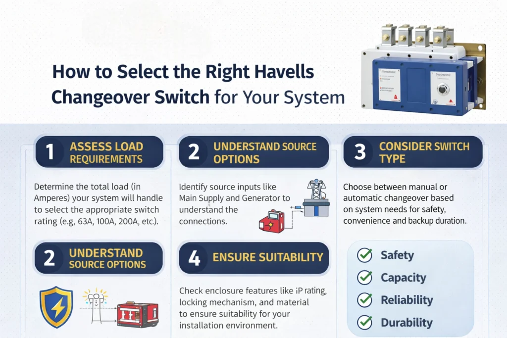 Selecting the right Havells changeover switch requires a structured evaluation of load requirements and application conditions. Industries should first calculate the total connected load and include a safety margin to prevent overloading during peak operation. The switch must match the system design and support reliable power transfer in real working environments.